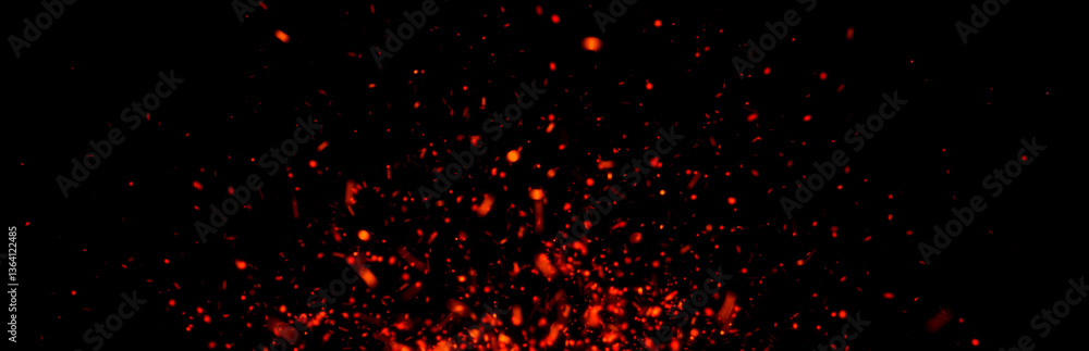 Glowing ember particles drift and flicker against a dark background, creating warm, intense energy with vivid fire sparks and abstract glitter in motion blur.