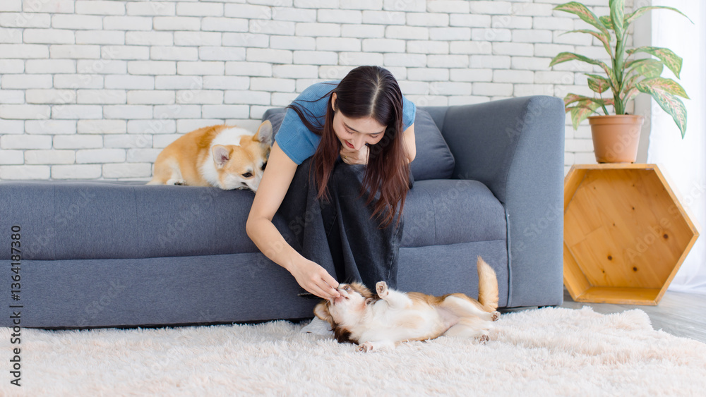 Portrait of young asian beautiful woman happy smile sitting on sofa playing cute welsh corgi dog and chihuahua dog animals on the floor in living room concept embracing lifestyle enjoy love pet friend