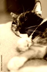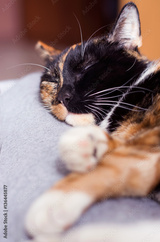Kot o kolorowym futrze śpi.