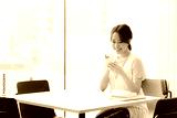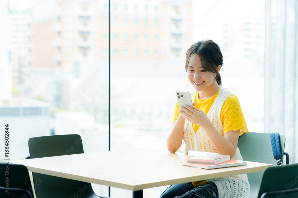 カフェでスマホを見る学生【撮影協力:スカパー東京メディアセンター】