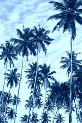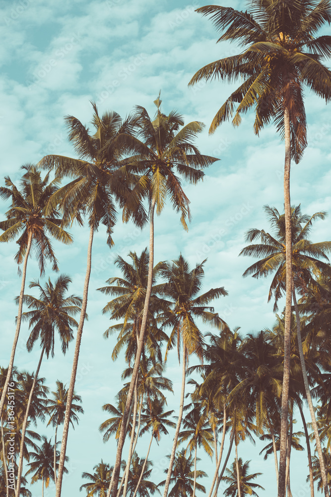 Coconut palm trees on tropical beach vintage nostalgic film color filter stylized and toned