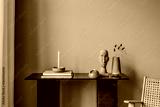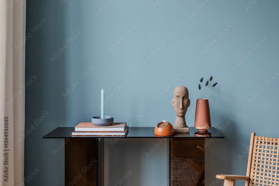 Modern console table with pastel candle, abstract head sculpture, and terracotta vase against blue wall.