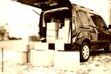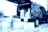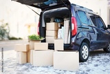 House moving concept. Cartoon boxes in a car trunk