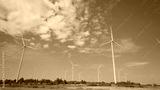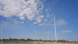 A wide view of wind turbines spread across a green landscape under a vibrant blue sky, showcasing renewable energy production.