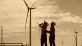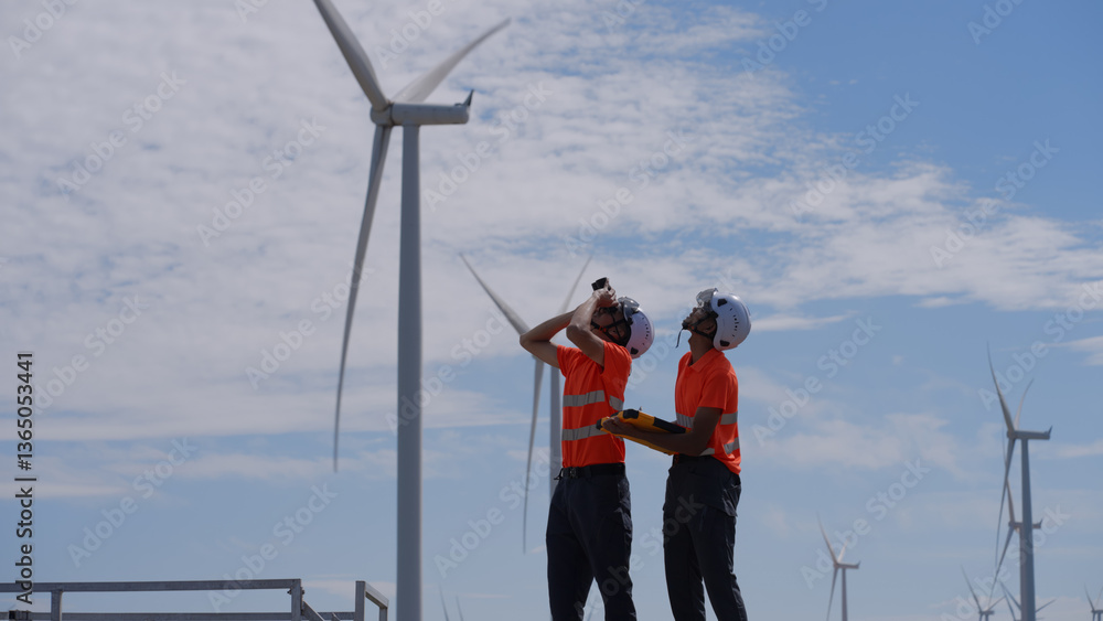 At a wind farm, two Asian inspectors are using binoculars to examine turbine blades for early damage, while recording data on a clipboard for maintenance planning. Engineer Wind Turbine