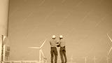 In a wind farm, a rear view shows two Asian inspectors are reviewing data on a tablet and clipboard to analyze system performance and blade rotation at varying wind speeds. Engineer Wind Turbine.