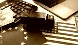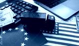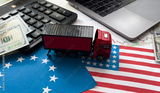 Logistics financing. Truck for transporting cargo. Calculator and money on logistics background. Graph of price fluctuations for logistics. Changes in prices for transporting goods by truck