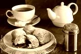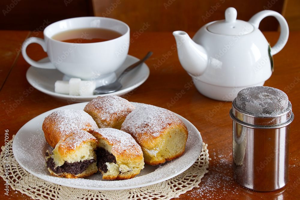 Sugared poppy seed buns on a plate with a cup of tea and porcelain pot on a wooden table. A sweet breakfast with lace placemats.