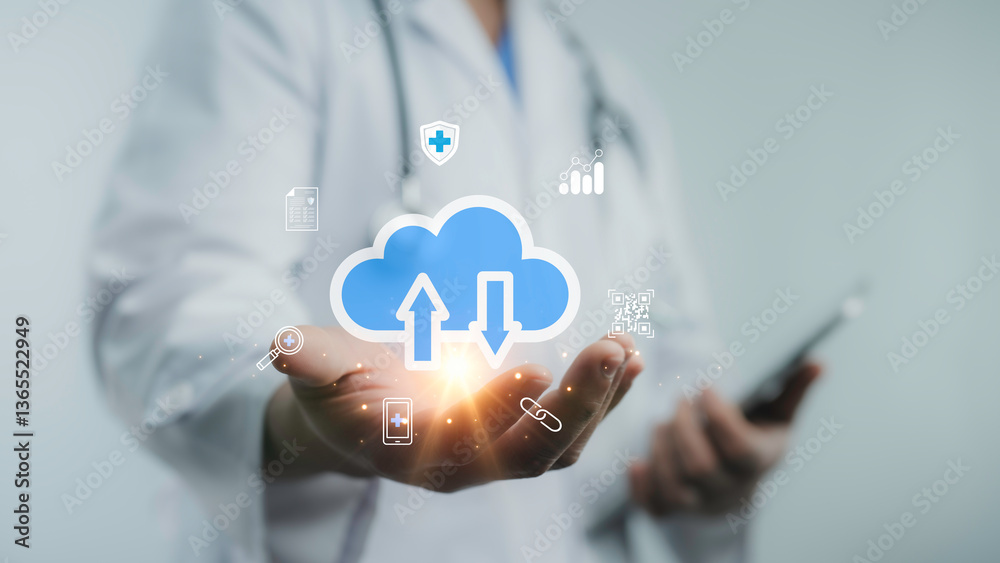 Doctor using cloud technology for secure data upload and download, symbolizing innovation in health information exchange and connectivity