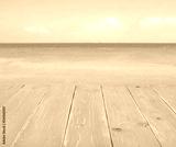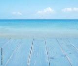 Turquoise background collage of wooden planks and blurred tropical seascape