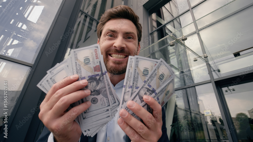 Moving shot happy rich wealthy Caucasian businessman in city looking in camera holding cash money dollars prize financial winning excited yelling celebrate finance bet success business man male guy