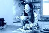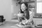 Beautiful young woman enjoying fresh salad with joyful smile in cozy kitchen filled with healthy ingredients