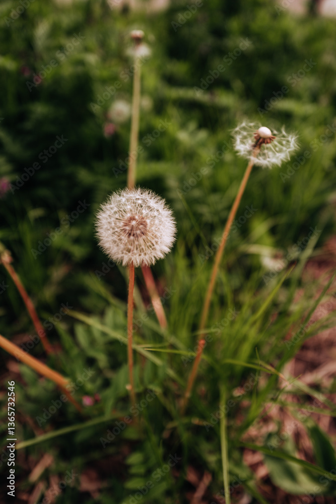 White dandelions on blurred green natural background, nature and plants for calendars, cards and botanical posters