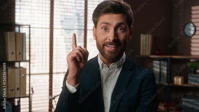 Thinking pensive Caucasian adult businessman male indoors business man guy employer manager in office working think job solution come up with idea ponder smiling happy find answer looking at camera