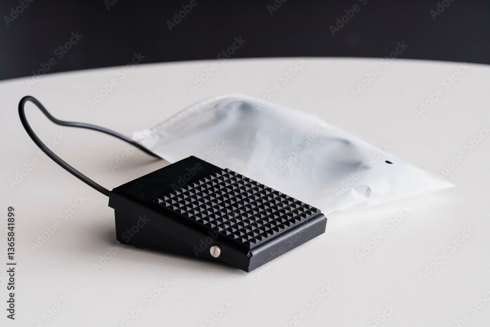 Black Foot Switch Pedal with Cable on White Surface Near Transparent Sterile Bag