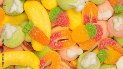 Mix of jelly candys and marshmallows as a background.