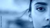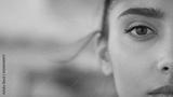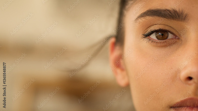 Close up health problem pensive peaceful half female face at home Indian woman Arabian girl look lady looking at camera serious indoors housewife girlfriend headshot eyesight vision laser correction