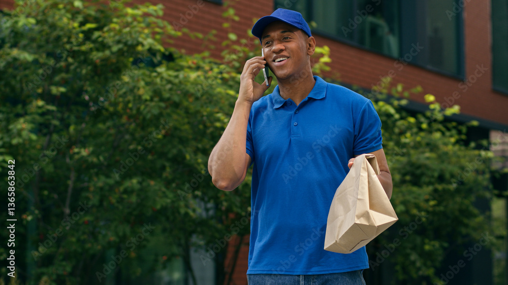 African American courier man talking call client mobile phone holding paper package bag food delivery product postal worker male guy cardboard post purchase deliver in city smartphone online shopping
