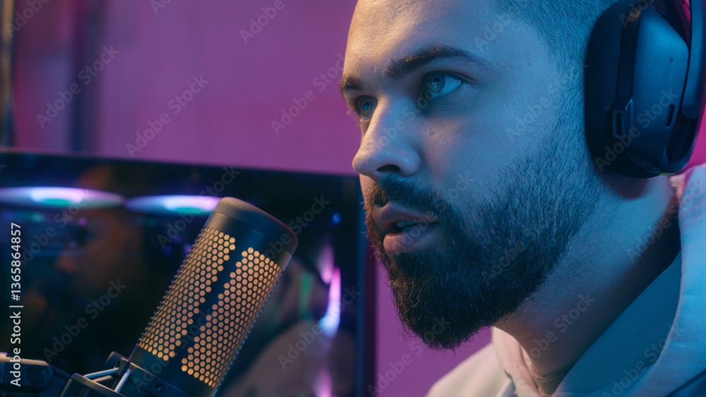 Caucasian man male guy gamer streamer radio host representor playing internet play online video game computer talking to microphone talk mic at night neon colorful lighting sport streaming web stream