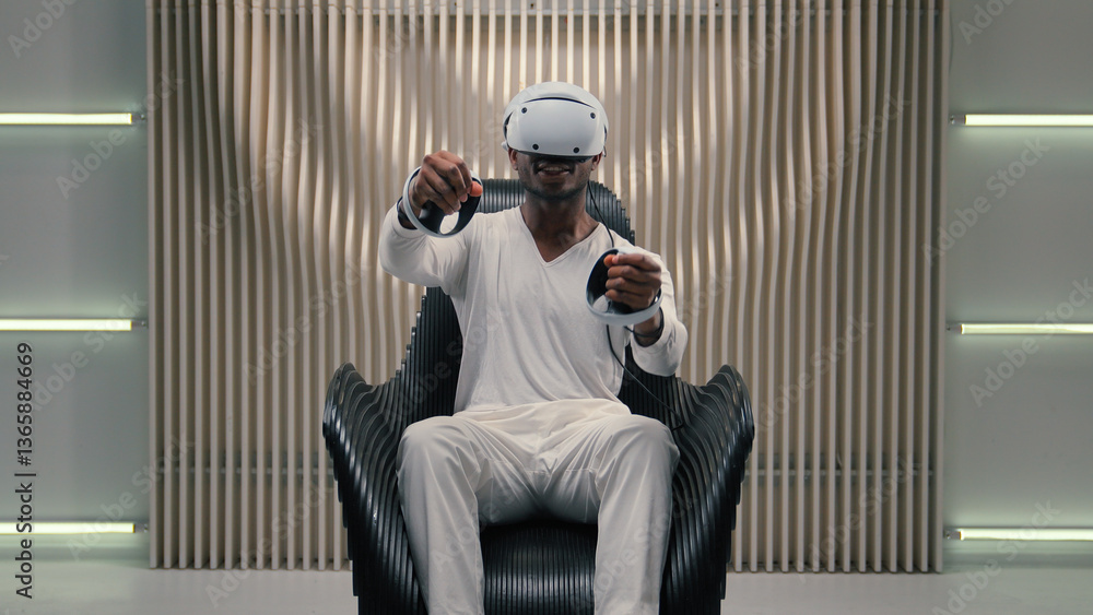 African American carefree man guy male wearing 3d virtual reality helmet VR glasses playing simulation online modern metaverse play pretend riding driving automobile car in futuristic white studio