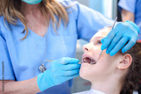 Girl with open mouth having her teeth examined by specialist. Teeth checkup at dentist's office.