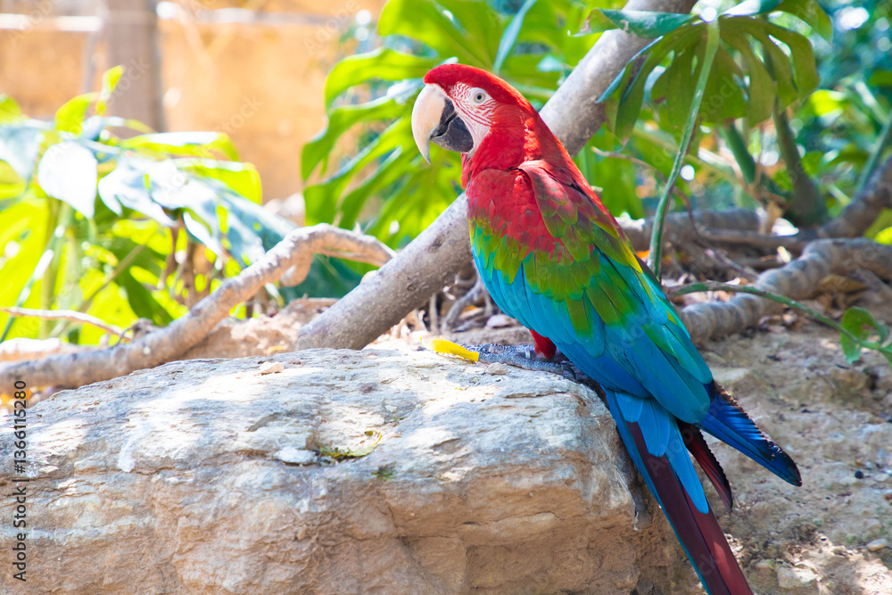 Colorful parrot perched on a rock in a lush tropical environment