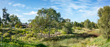 Expansive suburban nature reserve in Tarneit, Melbourne, Australia featuring a diverse natural environment with scattered trees, native grasses, and vegetation near residential houses.