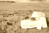 Summer beach essentials with sunglasses, sunscreen, towel, hearphones