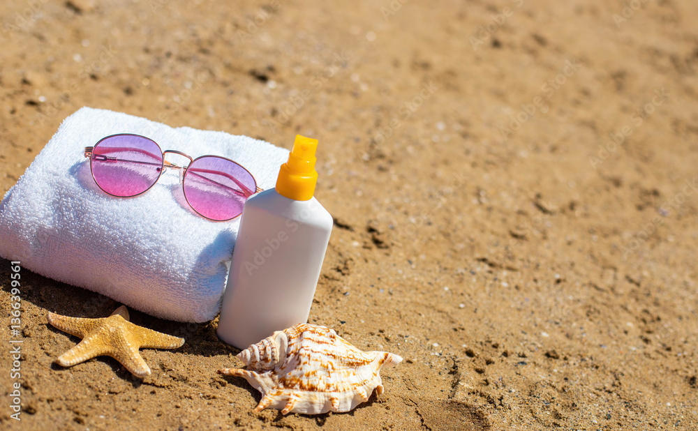 Summer beach essentials with sunglasses, sunscreen, and seashells