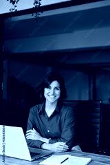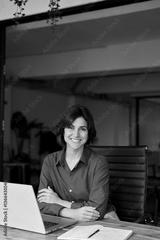 Vertical portrait of confident businesswoman leader in her 30s at work desk. Smiling Hispanic young woman entrepreneur, happy female executive manager looking at camera sitting working with laptop