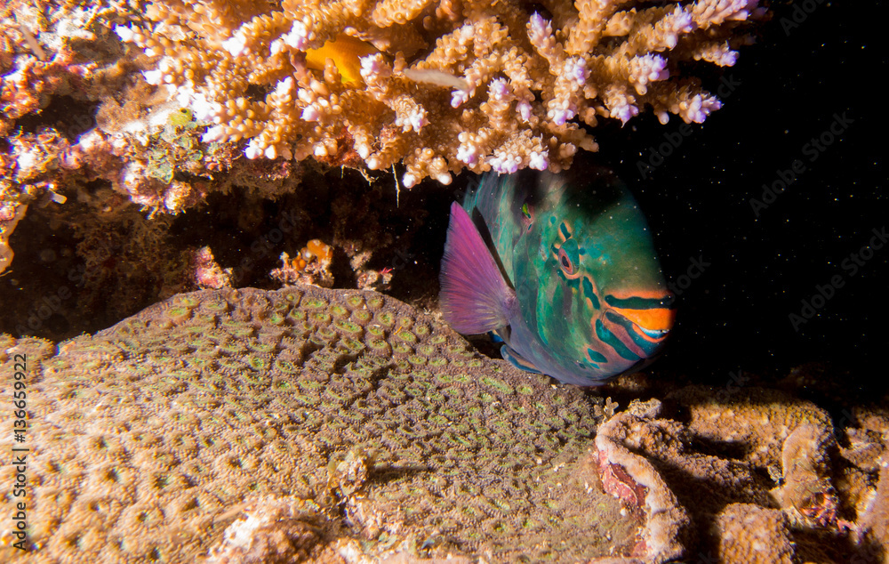 Colourful green parrot fish hiding under coral