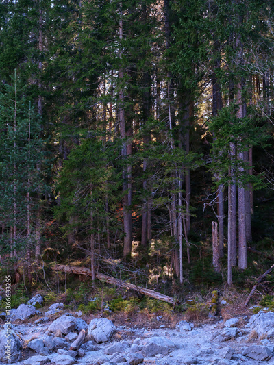 Dense forest with towering trees and rocky terrain in a serene natural setting during midday