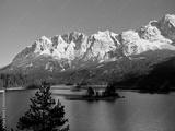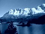 Majestic snow-capped mountains reflect in tranquil blue lake during bright sunny day