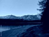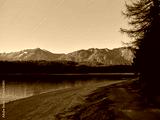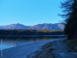 Tranquil lake view with mountains and clear blue sky during early morning hours