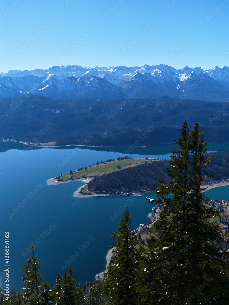 Stunning view of a mountainous landscape with a serene lake under a clear blue sky in the afternoon
