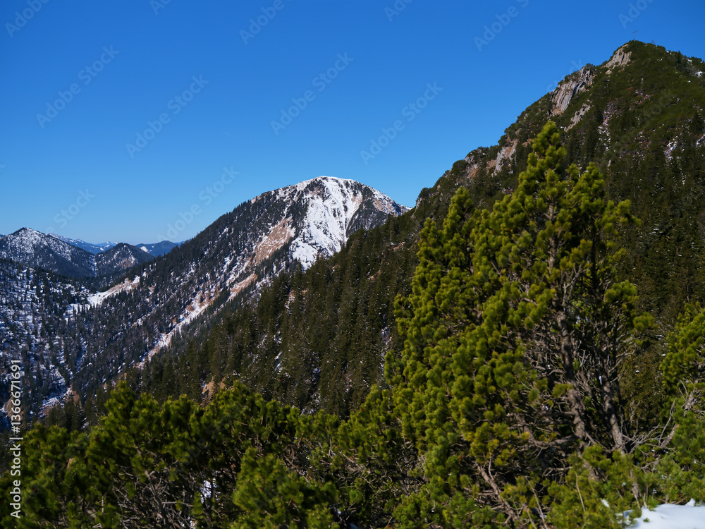 Snow-capped mountains rise against a clear blue sky with evergreen trees in the foreground during late winter