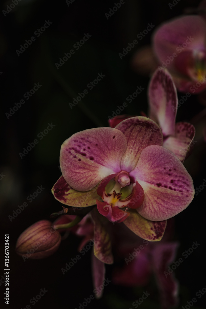 Vibrant purple and yellow orchid blooms elegantly in a tranquil setting during the evening hours