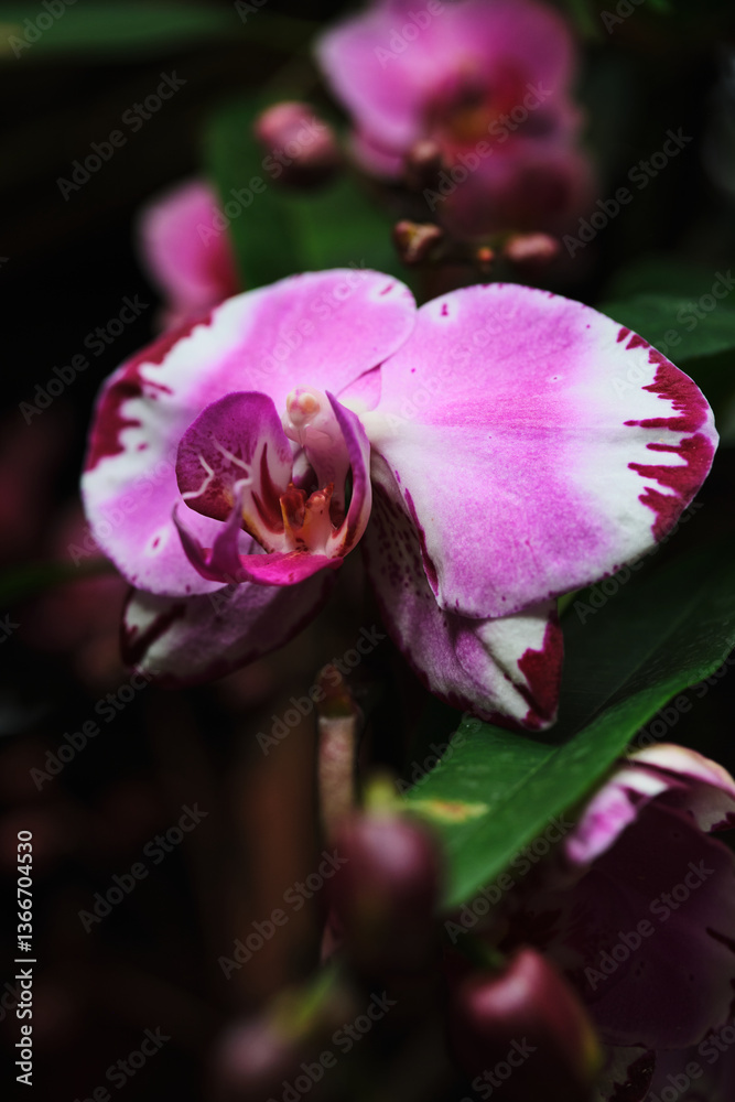Vibrant pink orchid blooms in a lush garden setting during late afternoon light