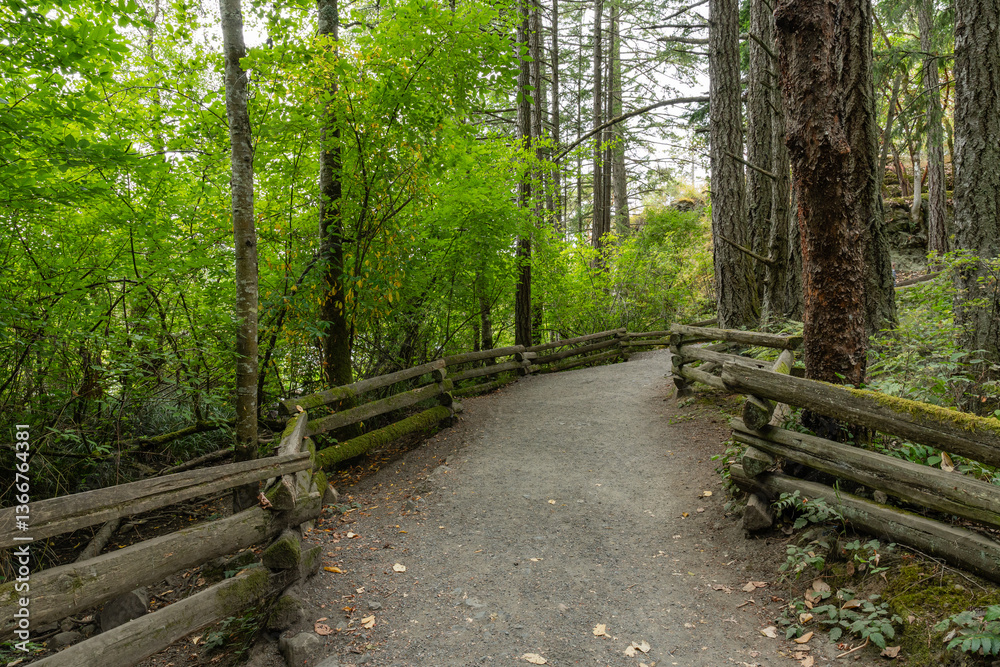 hiking trail in idyllic forest looking at mountain in summer at Thetis Lake Regional Park British Columbia Canada