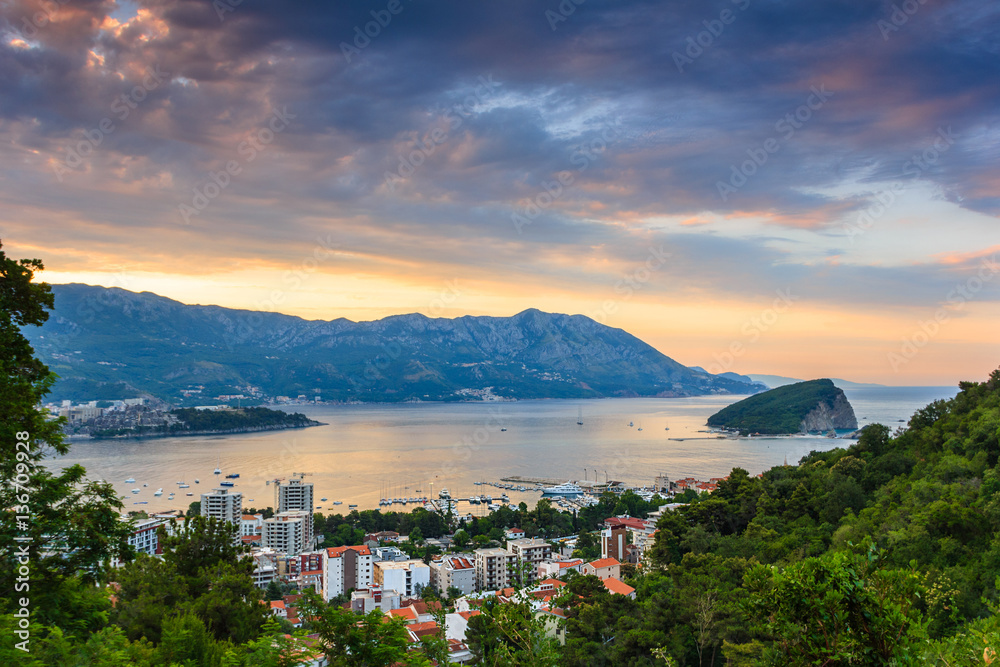 Panoramic landscape of Budva riviera in Montenegro. Dramatic morning light. Balkans, Adriatic sea, Europe. View from the top of the mountain.