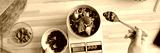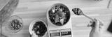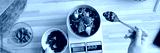 Hands presenting smoothie bowl with fresh fruit, nuts, and seeds on scale, surrounded by ingredients. Bright, clean surface highlighting food preparation process