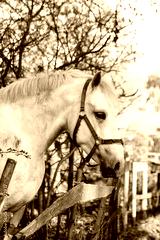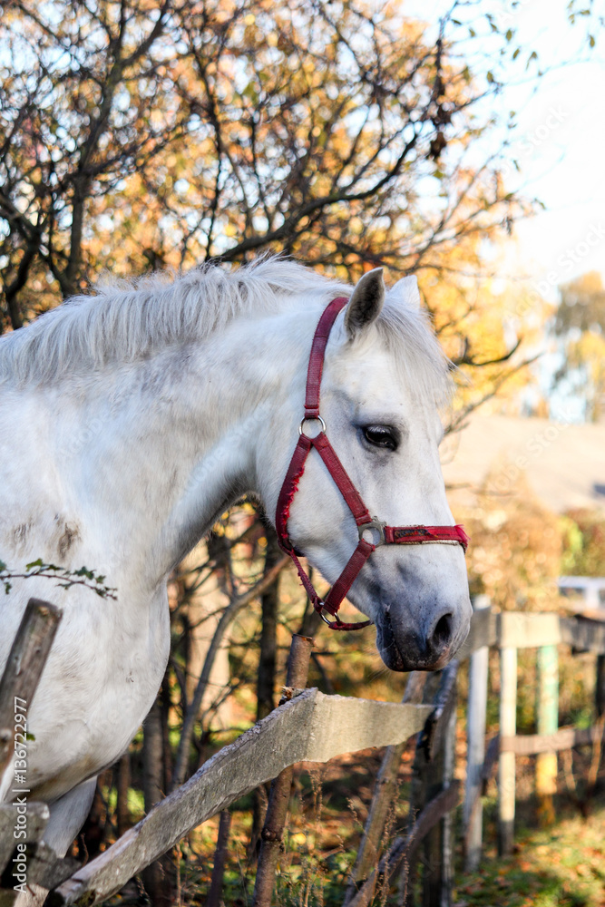 Portrait of beautiful white horse in the forest