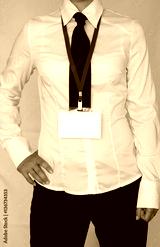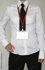 Woman wear blank white horizontal badge mockup, stand isolated. Name tag on neck and chest. Person identity label. Women in a shirt and tie with empty id card mock up. Bussinesswoman lanyard design.