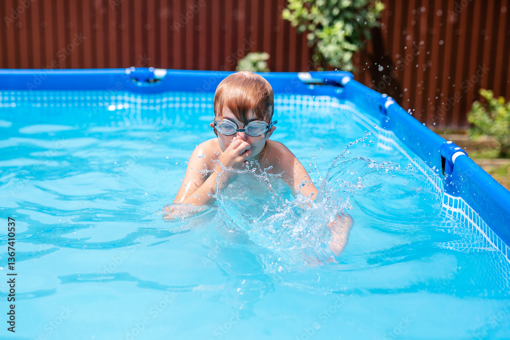 Boy in red swimwear jumping into backyard swimming pool holding his nose on sunny summer day