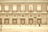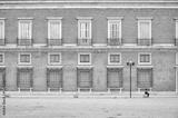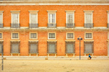 A woman rests on a bench next to the Royal Palace of Aranjuez, Spain.