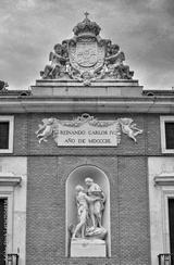 Elegance and grandeur: the neoclassical splendor of the Casa del Labrador, Aranjuez. Detail of facade showing date in Roman numerals, Madrid, Spain