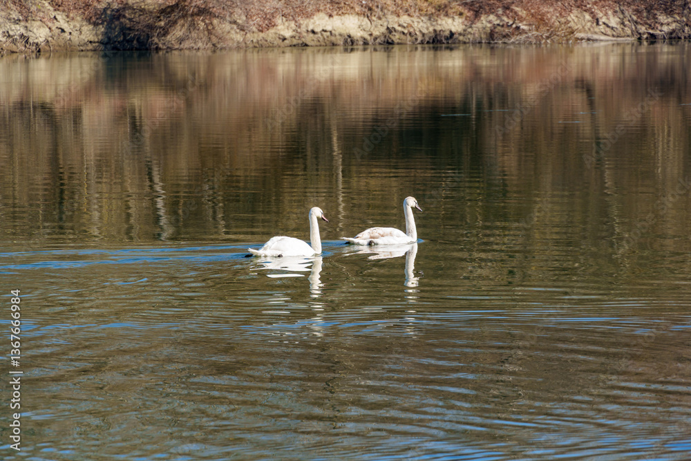 white birds swans swim along the river in the forest, bright sun and spring nature