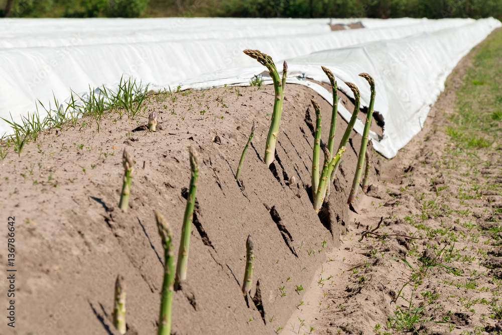 Spargelfeld mit Spargel (Asparagus officinalis) zur Ernte mit Fo