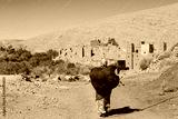 Moroccan woman carying a big bag with herbs with kasbah in the b