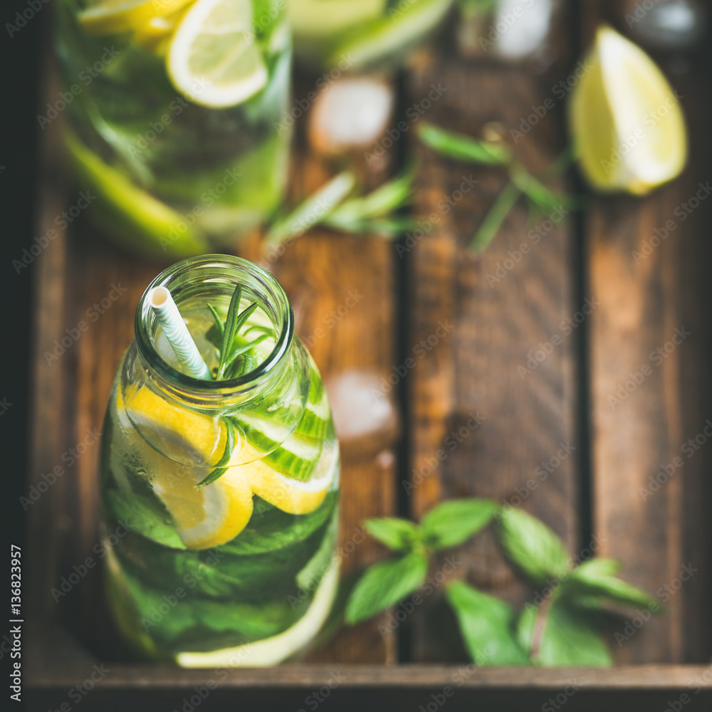 Citrus fruit and herbs infused sassi water for detox, healthy eating, dieting in glass bottles in wooden tray, selective focus, copy space, square crop. Clean eating, healthy lifestyle concept